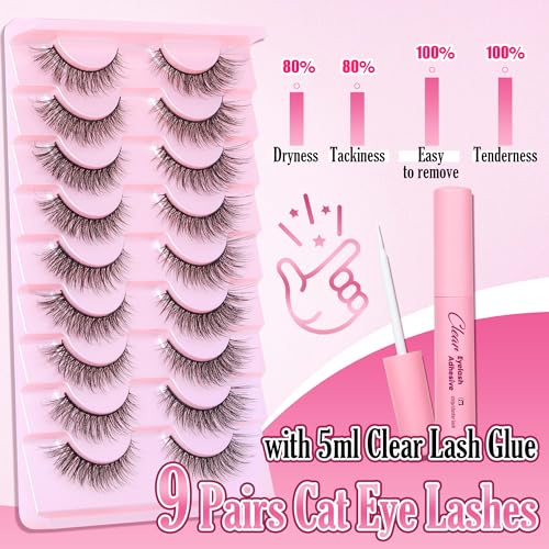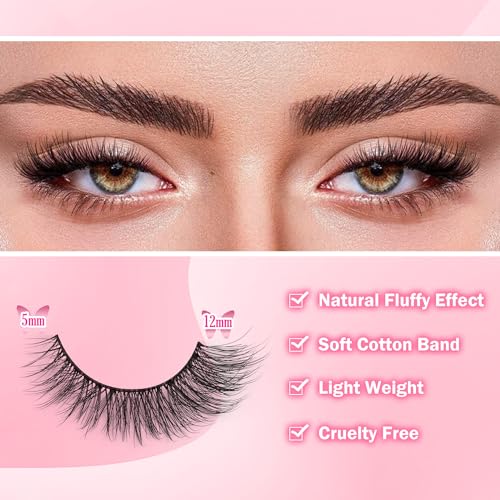 Natural Lashes Kit with Lash Glue 3D False Eyelashes Wispy 12mm Short Cat-Eye Lashes with 5ML Clear Eyelash Glue 9 Pairs Fake Eyelashes with Glue by TOOCHUNAG